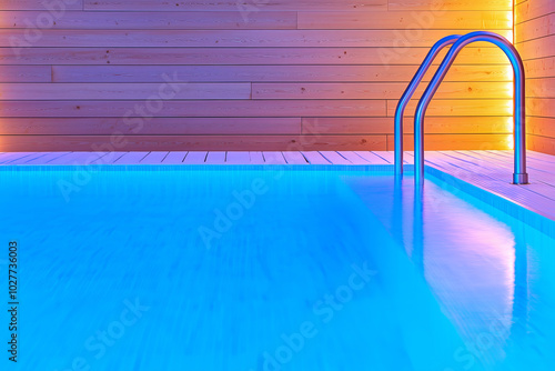 Modern indoor swimming pool with blue lights and wooden walls during evening relaxation time