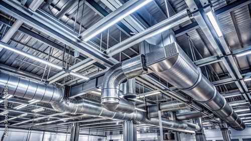 Modern industrial air conditioning system with rows of sleek silver vents and pipes installed on ceiling of a large manufacturing facility.