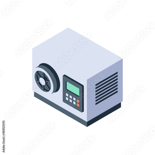 air conditioner, ventilation, appliance, electronic device, digital display, control panel, grille, fan, machine, technology, engineering, manufacturing, workshop, factory, production, facility, maintenance, operation, efficiency, performance, comfort, environment, solution, system, component, part, unit, device, instrument, apparatus, machinery, equipment, modern, sleek, compact, isometric, illustration