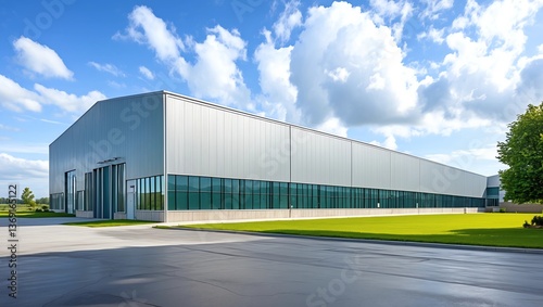 Modern industrial warehouse building with a sleek metal facade, large windows, and a spacious outdoor area under a bright blue sky. Ideal for manufacturing, logistics, and storage facilities.