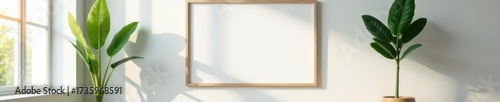 Modern interior, blank square frame, potted plant , interior design, display, template