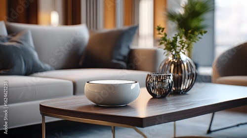 Modern Interior Living Room with Stylish Furniture and Elegant Decor Accessories on Wooden Table