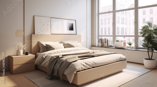 Modern interior of light bedroom with window. AI generated.