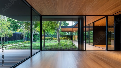 Modern interior showcasing large windows with a view of a landscaped garden.