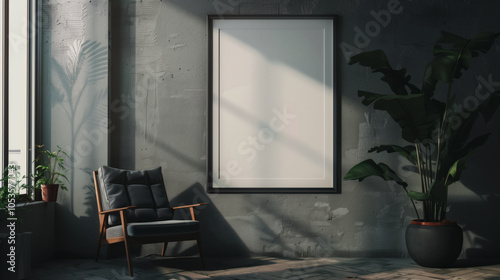 ai, generative, art, empty space, copy space, interior, blank, frame, picture, wall, nobody, contemporary, modern, horizontal, decoration, ornament, design, cosy, comfortable, built structure, fashionable, picture frame, furniture, luxury, elegance, idea, creativity, imagination, individuality, architecture, absence, home interior, decor, serenity, armchair, hardwood floor, potted plants, relaxation, apartment