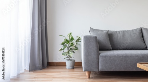 Modern interior with gray sofa and clean lines, perfect for design inspiration, real estate marketing, or contemporary living concepts.