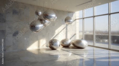 interior, modern, polished, sphere, metal, light, wall, floor, window, space, architecture, design, contemporary, sunlight, reflections, glasses, empty, large, smooth, calm, geometric, abstract, art, sculpture, hanging, rounded, oval, bright, clean, roomy, sunny, marble, paneling, exterior, view, city, urban, daylight, perspective, minimalist, elegant, sophisticated, neutral, grey, silver, commercial, public