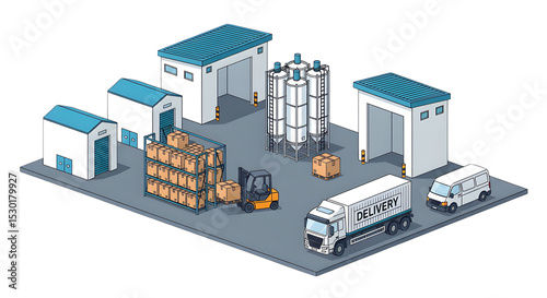 Modern Isometric Warehouse Distribution Center Illustration with Delivery Trucks and Forklift
