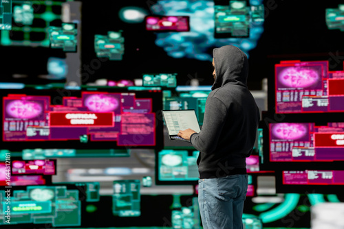 Modern IT attacker uses programming and system override strategy to launch malware and penetrate secure access points. Highlighting cyber crime, hacker practices hacktivism with AI.