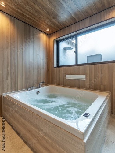 Modern Japanese Bathroom with Wooden Walls and Soaking Tub