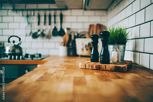 kitchen, countertop, wood, spice, salt, pepper, modern, decor, home, interior, design, clean, organised, minimalist, stylish, cooking, food, dining, apartment, house, living, space, natural, light, simple, functional, beautiful, rustic, elegant, comfortable, practical, cosy, fresh, kitchen utensile, table, pot, utensil, accessory, furniture, lifestyle, plant