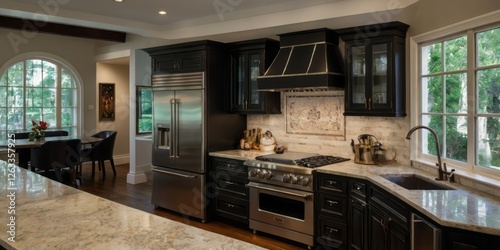 kitchen, cabinet, stainless, steel, appliance, counter, countertop, sink, window, faucet, dark, wood, floor, dining, table, chair, refrigerator, oven, stove, range, hood, backsplash, kettle, bottle, glassware, decor, interior, design, home, house, architecture, elegant, modern, luxury, residential, room, light, indoor, arch, view, greenery, plant, tree, artwork, painting, beam, ceiling, detail