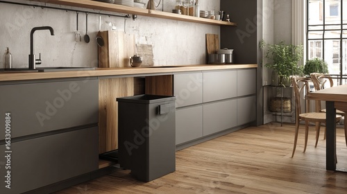 Modern kitchen featuring sleek cabinetry with wooden accents, minimalist design, and natural light from large windows.