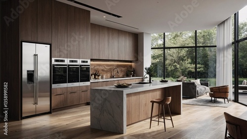 Modern kitchen featuring wooden cabinetry and sleek appliances, abundant natural light accentuates the spacious layout.