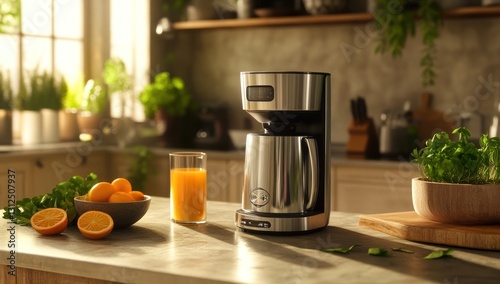 kitchen, coffeemaker, stainless steel, modern, appliance, fresh, breakfast, healthy, drink, orange, glasses, juice, morning, home, style, design, interior, decor, countertop, food, fruit, vitamin, lifestyle, domestic, house, room, sunlight, bright, clean, natural, epicure, delicious, refreshing, energy, vibrant, plant, bowl
