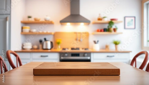 Modern kitchen interior with kitchen utensils, refrigerator, shelves, and a clean design, featuring fresh food and vegetables in an empty room