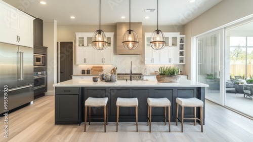 Modern Kitchen Island with Pendant Lights and Bar Stools