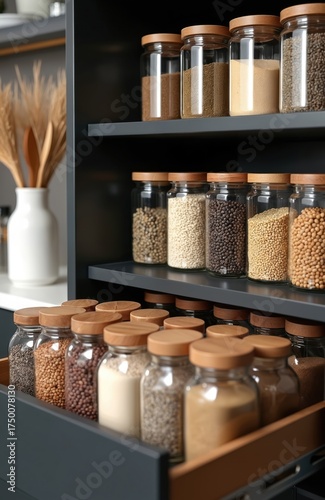 pantry, kitchen, storage, jar, grain, spice, food, organised, modern, home, container, shelf, cooking, healthy, ingredient, seed, culinary, domestic, clean, minimalist, design, organisation, cupboard, clear, transparent, collection, preparation, nourishment, lifestyle, interior, dry, bulk, eco, friendly, zero, waste, sustainability, neat, smart, contemporary, fresh, living, well-being, life, decor, edible, assortment, supply, provision
