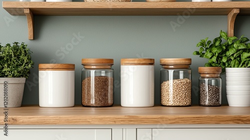 kitchen, storage, jar, wooden, countertop, spice, herb, grain, minimalist, design, organisation, home, decor, clean, aesthetic, container, glasses, pantry, plant, greenery, plant, surface, cooking, food, material, modern, rustic, interior, arrangement, simple, natural, style, household, supply, baking, eating, ingredient, brown, white