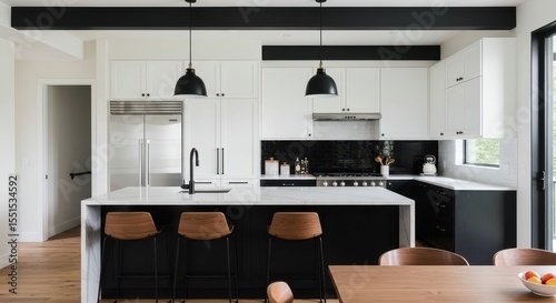 kitchen, modern, white, black, cabinet, island, countertop, marble, pendant, light, stainless, appliance, roomy, design, contemporary, furniture, interior, wood, chair, dining, table, fresh, bright, clean, stylish, home, functional, elegant, dark, minimalist, minimalism, sophisticated, neutral, warm, comfortable, practical, efficient, organised, cleanliness, quality, luxurious, homelike