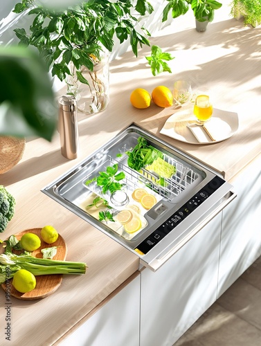 kitchen, dishwasher, modern, built-in, appliance, stainless steel, countertop, cabinet, drawer, open, fresh, produce, lime, greener, celery, greenery, sunlight, shadow, wooden, home, interior, design, style, contemporary, clean, bright, minimalist, sleek, functional, efficient, environmentally friendly, sustainable, healthy, lifestyle, home decor, cooking, food, fresh food, fruit, vegetable, natural