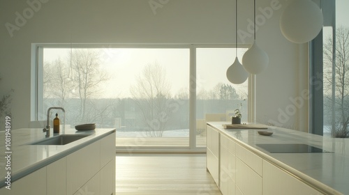 kitchen, modern, window, large, white, cabinet, countertop, sink, faucet, wood, floor, light, sunlight, tree, snow, winter, nature, minimalist, clean, simple, design, interior, home, house, decor, contemporary, style, bright, roomy, airy, open, view, landscape, serene, peaceful, calm, tranquil, cosy, comfortable, elegant, stylish, beautiful