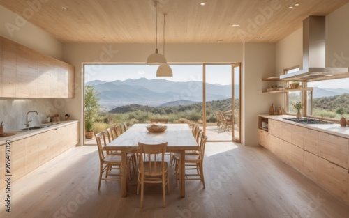 modern, kitchen, wooden, dining, table, chair, traditional, white, cabinet, large, window, natural light, island, sink, stove, oven, ceiling, wall, painted, beige, floor, plank, background, mountain, view, blue, sky