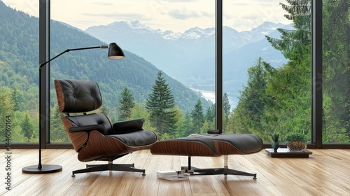 mountain, view, panoramic, window, forest, nature, wood, landscape, chair, ottoman, leather, furniture, interior, design, home, room, modern, contemporary, wood, floor, light, lamp, decor, stylish, comfortable, relaxation, peaceful, calm, minimalist, elegant, space, cosy, living, area, detail, style, ambient, evening, tree, river, mountain, sunlight, calmness, quiet