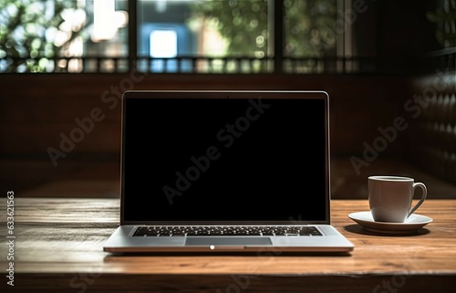 Modern lifestyle. Coffee shop office. Laptop and cup on stylish cafe table for remote work. Business concept