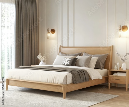 bedchamber, furniture, oak, wood, bed, light, modern, neutral, decor, minimalist, style, contemporary, design, elegant, sophisticated, calming, serene, peaceful, cosy, comfortable, inviting, warm, soft, cushion, pillow, throw, blanket, grey, beige, white, lamp, wall, sconce, curtain, nightstand, rug, floor, room, interior, home, house, texture, line, simple, clean