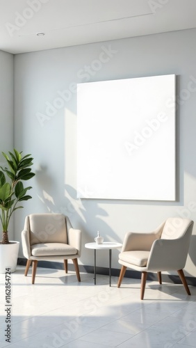 modern living room. A mockup of an empty white poster on the wall in modern hospital waiting room with comfortable chairs and medical equipment