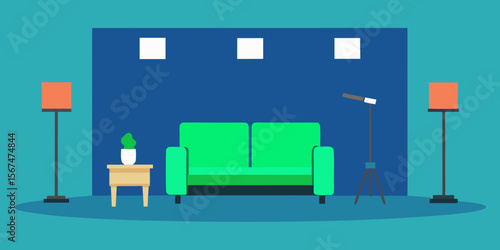 Modern Living Room Interior Design Cozy Green Sofa, Minimalist Decor, and Ambient Lighting