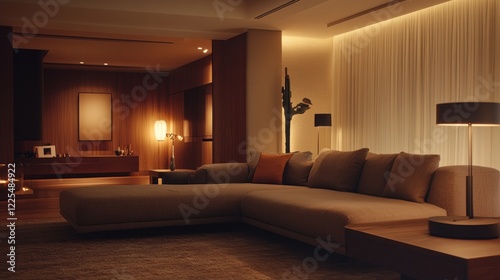 living, room, interior, design, warm, lighting, modern, couch, sofa, sectional, beige, cushion, pillow, lamp, floor, rug, carpet, wood, table, hot drink, curtain, wall, artwork, frame, plant, decor, home, house, style, elegant, comfortable, ambient, luxury, contemporary, relaxed, evening, night, space, atmosphere, texture, comfort