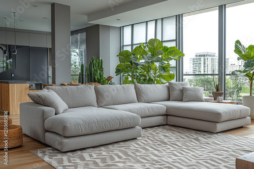 living, room, interior, modern, sofa, sectional, city, view, plant, indoor, home, apartment, design, decor, furniture, luxury, comfortable, roomy, light, bright, airy, window, kitchen, house, style, contemporary, architecture, real estate, lifestyle, cosy, elegant, minimalist, urban, city landscape, green, natural, living room, couch