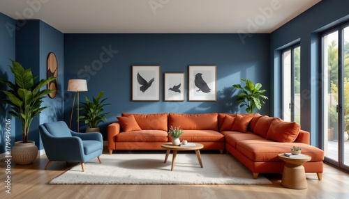Modern living room interior with orange couch, blue chair, and stylish decor in contemporary design setting
