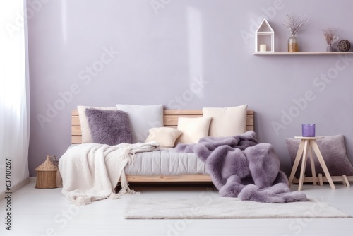 modern living room interior with sofa with light purple pillows and plaid, mockup for a picture art frame, on white wall background with sunlight