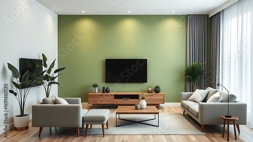 Modern living room with a green accent wall and minimalist furniture, creating a serene and stylish space.