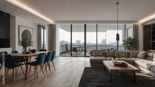 Modern living room with a stunning city view, featuring a spacious layout and contemporary furnishings.