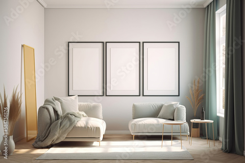 modern living room with bright beige sofa and colorful decoration, indoor plant, big empty frames on the wall, contemporary design, generative ai