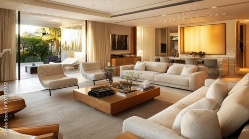 Modern living room with elegant furniture and large windows, creating a bright atmosphere.