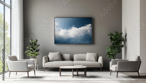 living, room, modern, interior, design, decor, furniture, sofa, armchair, hot drink, table, plant, art, framed, print, wall, sky, cloud, nature, contemporary, neutral, beige, grey, home, apartment, style, elegant, roomy, window, view, foliage, fife, cosy, relaxing, space, comfort, texture, minimalist, simple, accent, lighting, ambience, bright, calm, peaceful, dreamy, serene, tranquil