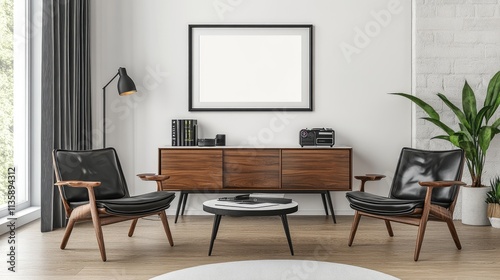 room, modern, living, mid, century, chair, wooden, cabinet, black, leather, floor, wood, table, lamp, frame, picture, book, plant, white, wall, design, interior, style, home, decor, furniture, minimalist, aesthetic, space, cosy, comfortable, elegant, sophisticated, retro, vintage, contemporary, stylish, light, window, curtain
