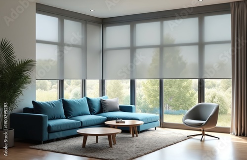 Modern living room with teal sectional sofa and accent chair. Large windows with sheer roller blinds overlook green trees and nature. Interior design space offers comfort and natural light.