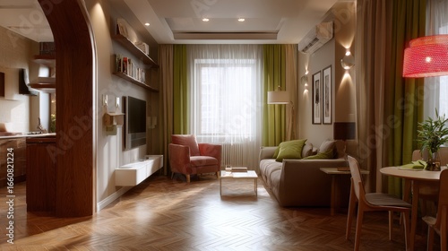 modern, living, dining, room, interior, design, visualisation, warm, natural, tone, herringbone, parquet, floor, white, beige, brown, green, curtain, red, pendant, lamp, cherry, arch, doorway, cocoa, clothes rack, round, table, chair, television, armchair, spotlight, lamp, long, ceiling, height, contemporary, home, cosy, elegant