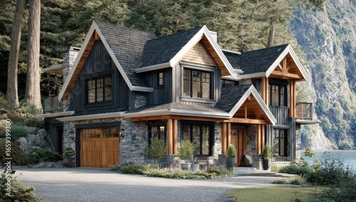 house, home, cabin, log, modern, luxury, design, contemporary, chalet, exterior, wood, stone, dark, black, grey, roof, window, door, porch, garage, garden, landscape, tree, forest, mountain, nature, vale, architecture, property, dream, vacation, relaxation, elegant, rustic, charming, cosy, stylish, stunning, beautiful, impressive, residence, estate, picturesque, dreamy, view