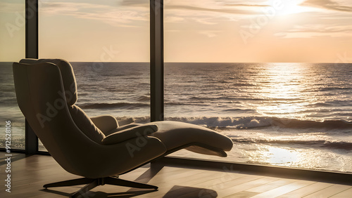 Modern lounge chair by a large window overlooking the sea, nature