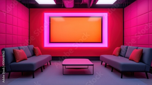 lounge, modern, interior, neon, design, furniture, seating, cushion, colours, wall, lighting, decor, minimalism, space, cosy, contemporary, room, ambience, vibrant, stylish, relaxation, picture, display, technology, creative, aesthetic, architecture, indoor, bright, comfortable, visual, atmosphere, urban, trend, textile, sofa, modern art, chic, organisation, arrangement, art, beauty, inspiration