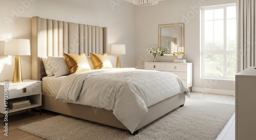 Modern luxury bedroom interior with beige upholstered bed, gold accents, large window, white furniture, and natural light