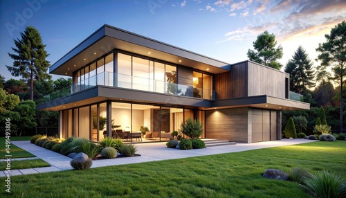 Modern Luxury Home at Twilight Elegant Design Landscaping.