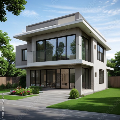 Modern luxury house with a well-manicured lawn..